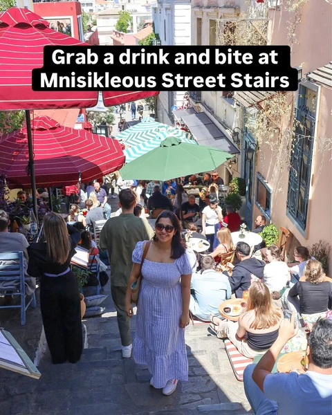 In the heart of the Plaka district, the stairs of Mnisikleous Street (Οδός Μνησικλέους) are lined with cafes where patrons sit on cushions placed directly on the steps. It is an ideal spot to grab a Greek coffee or a refreshing drink, enjoy some light bites, and soak up the lively atmosphere.