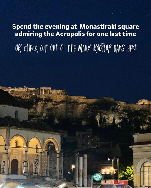 Monastiraki Square is a vibrant hub of activity day and night. Known for its flea market, the square is surrounded by shops, historic landmarks like the Tzistarakis Mosque, and Hadrian's Library. In the evening, the area comes alive as people gather to admire the illuminated Acropolis from the square or from one of the many popular rooftop bars nearby, such as A for Athens or 360 Cocktail Bar.