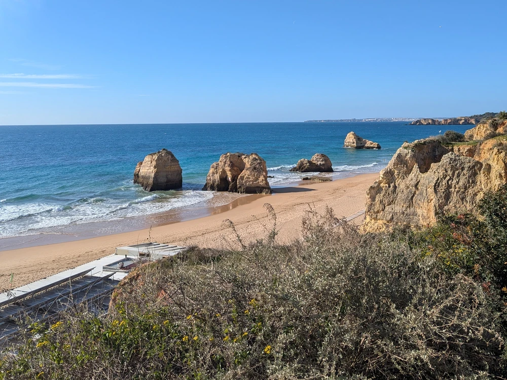 Praia da Rocha is Portimão’s most famous beach and a major draw for visitors across the Algarve. Located along the city’s southern edge, it offers a wide expanse of golden sand backed by dramatic cliffs and a lively boardwalk. Despite its popularity, the beach is large enough to accommodate crowds while still offering room to relax. It’s one of the most activity-rich beaches in the region, with options ranging from water sports and volleyball to seasonal festivals. Its easy accessibility, variety of amenities, and vibrant atmosphere make it a central hub for beachgoers.